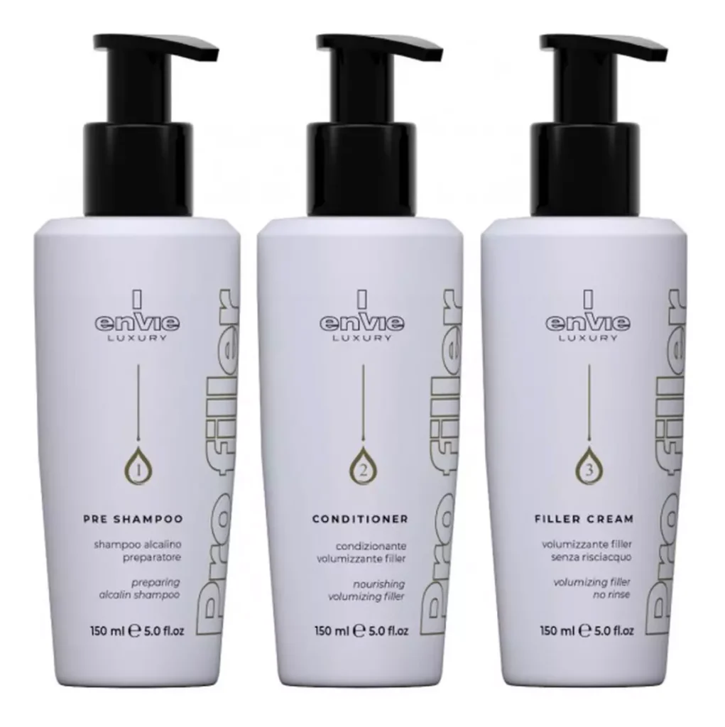 ENVIE PRO FILLER procedūra yra profesionali plaukų atstatymo procedūra, skirta pažeistiems, pažeistiems ir ploniems plaukams atkurti, suteikiant jiems apimties, stiprumo ir blizgesio. Procedūra apima kelis etapus, kai kurie produktai, tokie kaip „Botox Hair 24K”, giliai įsiskverbia į plaukų pluoštą, užpildydami pažeistas vietas ir restruktūrizuodami plauką.
