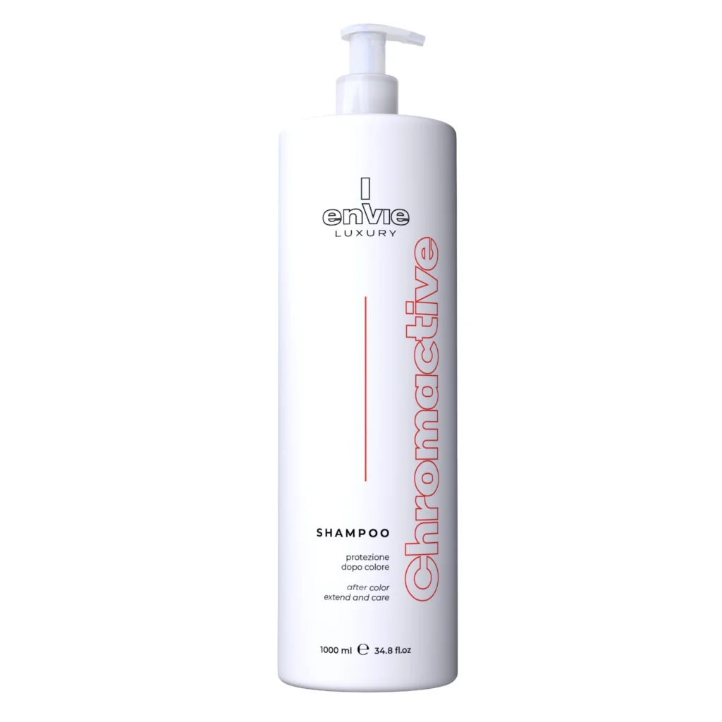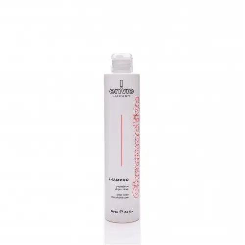 ENVIE Luxury Chromactive šampūnas su granatų ekstraktu ir rūgštiniu PH skirtas dažytų plaukų spalvai išsaugoti. Produktas veiksmingai bei šveniai išplauna ir kondicionuoja plaukus. Šampūnas puikiai tinka dažytiems ir pažeistiems plaukams.