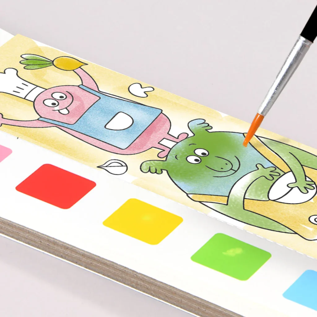 Knygelėje rasite integruotus akvarelės dažus ir teptuką – todėl nereikia jokių papildomų priemonių. Tereikia pamirkyti teptuką vandenyje ir pradėti spalvinti!